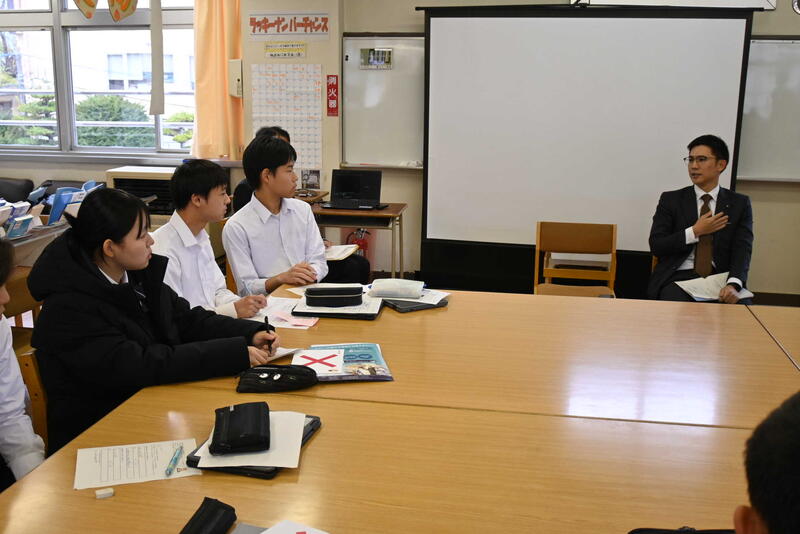 若者の政治への関心を高めるために、群馬県議会議員の皆様が高校等を訪問し、生徒と意見交換する事業「GACHi(ガチ)高校生×(かける)県議会議員~政治を知らなきゃソンをする!~」を実施しています。本校でも、11月13日(木)に群馬県議会より酒井宏明議員、中島豪議員の2名がご来校なさり、本校の1年生を対象に、「GACHi高校生✕県議会議員」が実施されました。